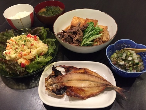 (月) アジの開き、肉豆腐、ポテトサラダ、山形のダシ