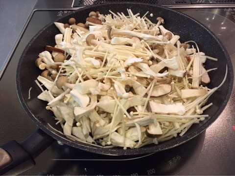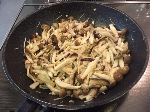 きのこ類は火を入れるとカサが減るので、最初はこんなにフライパンにてんこ盛りにあったきのこたちも・・・・