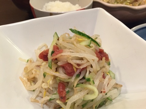 もやしときゅうりの梅あえ。やっすーい副菜で、しかもパパッと簡単にできます!(笑)