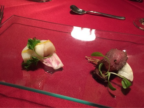 まずは前菜。カニのムースなんたらかんたらと、エゾジカのローストなんたらかんたらです(笑)
