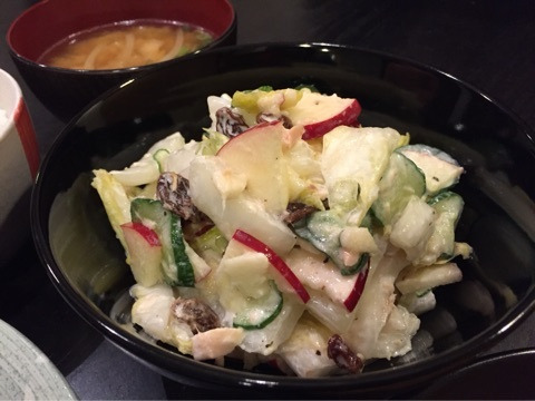 きゅうりの薄切りと白菜はあらかじめ塩揉みしてしんなりさせてからぎゅっと絞って、ツナ、りんご、レーズンと一緒にオリーブオイル、マヨネーズ、レモン汁等々で和えます!