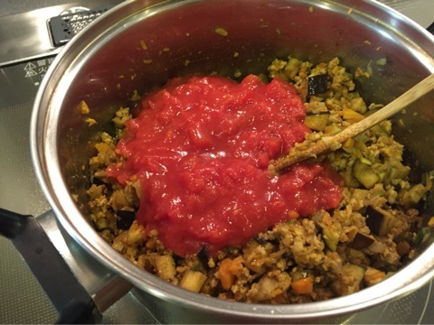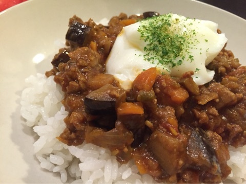 トマトベースのキーマカレー、おいしいですよ♪あ、言い忘れましたが、ナスも1センチ角ぐらいにして途中で入れてます(笑)