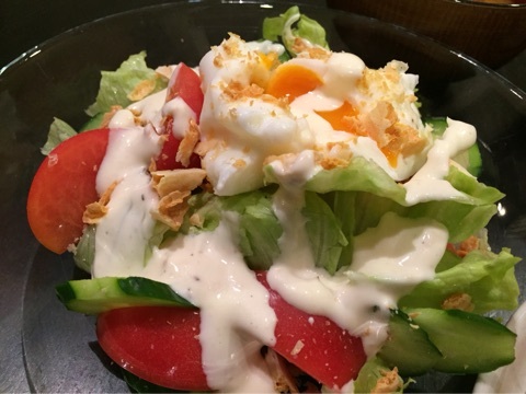 でも、ポーチドエッグが乗って、ドレッシングがシーザーサラダ用のだったら、普通のサラダよりは重たい感じですよね?(笑)