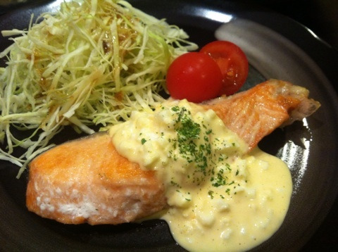 鮭は小麦粉をはたいて普通にバターでムニエルにして、上には、ゆで卵を潰してマヨネーズ、酢を入れただけの簡単タルタルです。玉ねぎとかピクルスとか入れなくても、タルタルっぽいでしょ?( ´艸`)