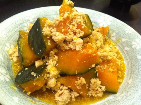 かぼちゃのそぼろ煮、少し煮汁にとろみをつけました。そぼろがデカイのは、ムネ肉を家でフードプロセッサにかけた挽き肉だからでーす!(笑)