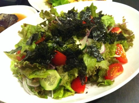 サニーレタスときゅうり、トマト、レッドオニオンしか入ってないんですけど、上に韓国海苔をくしゃくしゃっとやって乗せた後、味付けはごま油とミルで引いた岩塩のみ!