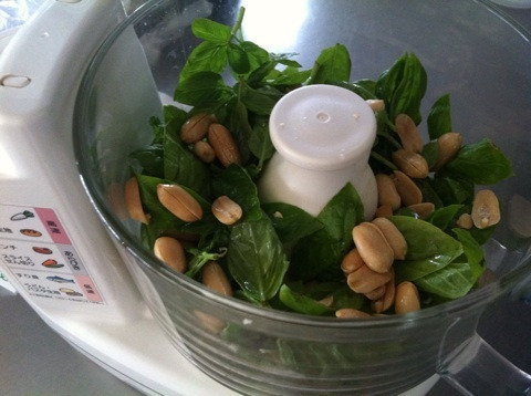 バジルのほうは、ニンニクとオリーブオイル、ピーナッツ(本当は松の実がよろしいです)、塩とともにフープロでがーーーっと!(*゚∀゚)=3