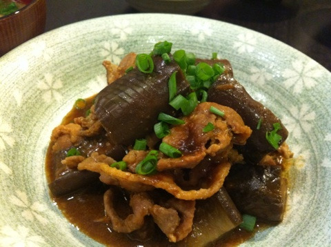 ナスと豚こまのみそ煮。豚こまは塩麹漬けになっていたものなので、やわらかくなっています♪