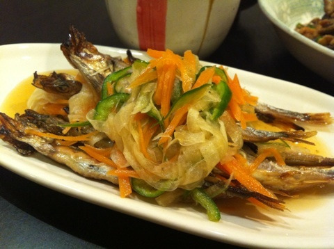 ししゃもの南蛮漬け。いつもはししゃもに小麦粉をつけてフライパンで焼いたものをつけ汁に漬けるのですが、今回はグリルで普通に焼いた焼きししゃもをそのまま漬けました!2日間つけておいたので、味もバッチリしみていてししゃももやわらかかったでーす!
