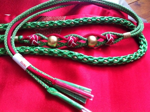 最近の帯締めは真ん中に来るところにいろんな飾りがついていて華やかですね~☆昔の紐一本と比べたらえらい違い!∵ゞ(≧ε≦● )プッ