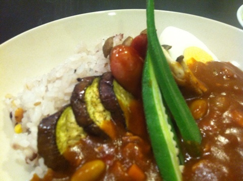 素揚げ(もしくは揚げ焼き)にした野菜をごはんの上に盛り付けて、あとからルーをかけるとキレイに盛り付けられます^^
