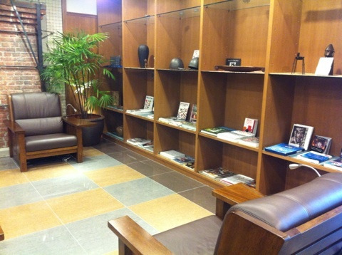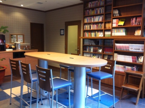 ロビー横の図書コーナー。向かい側はパソコンコーナー。
