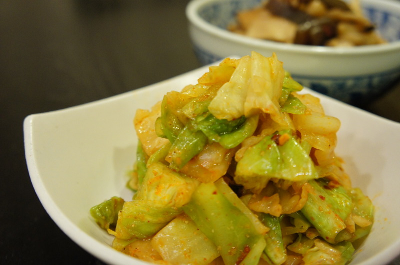 なので、食べるラー油でやったんだけど、色が・・・・・こんなんになっちゃいました。せっかく緑のきれいな色のキャベツだったのに~残念!