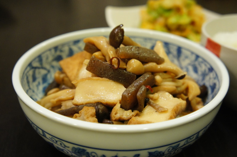 ということで、ヘンテコな副菜・・・・・こんにゃくと厚揚げときのこの炒め煮!∵ゞ(≧ε≦● )プッ