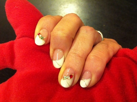 パールホワイトの斜めフレンチに、赤・緑・クリアのストーンとゴールドのスタッズ、シルバーの斜めラインを入れてもらいました~(´∀`)