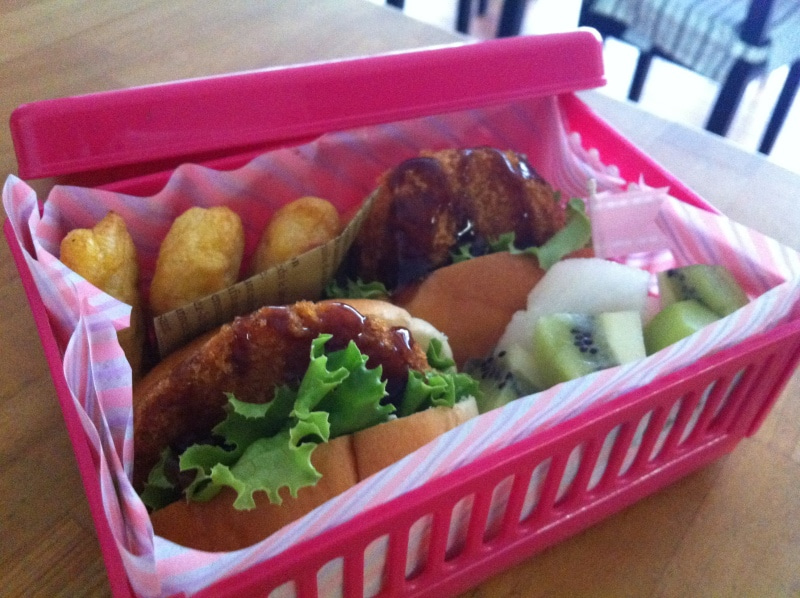 すき間には冷凍しておいたチキンナゲットと梨とキウイ(実家からもらう)を詰めてできあがり!
