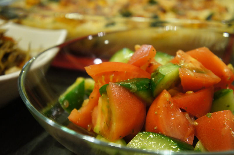 トマト、キュウリを、塩レモン、オリーブオイル、クレソルで適当にマリネしてます。