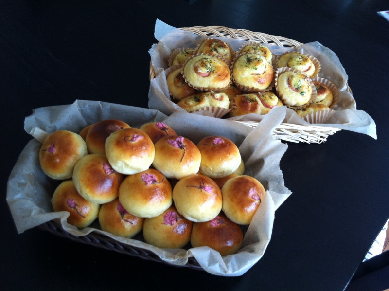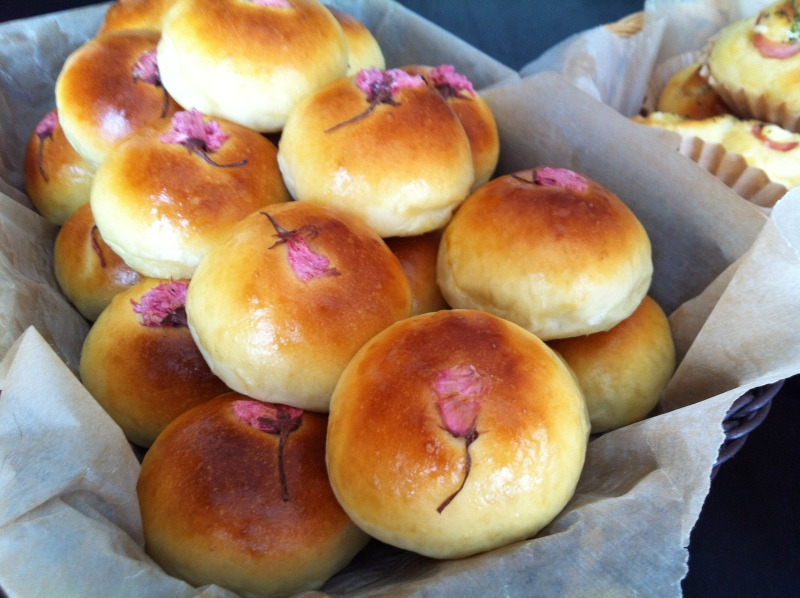 あんパンの上に乗ってるのは、桜の塩漬けだよ。おめでたいときに出る桜湯、あれの桜。お茶コーナーに売ってると思う。ポポちゃんの職場でもあると思うよ。聞いてみー♪