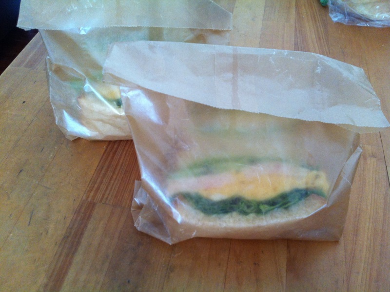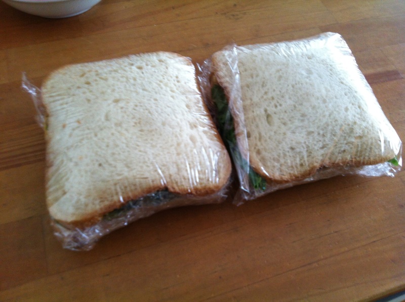 ラップに巻いてあるので、切るときも普通のサンドイッチより上手に切れますよね☆