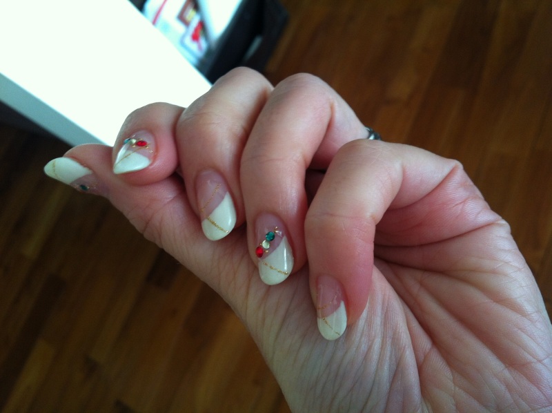 この赤・緑・クリアのストーンのついたクリスマスネイル、