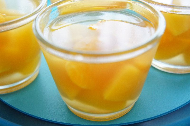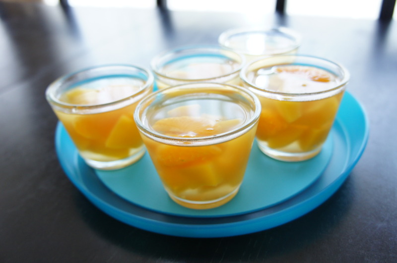去年、夏の時期にまりえちゃんに教わった缶詰の汁を使ったデザート、朝食に子供が絶対フルーツやらヨーグルトを食べてくでこの手のゼリー、ひっで重宝してるざ!!
