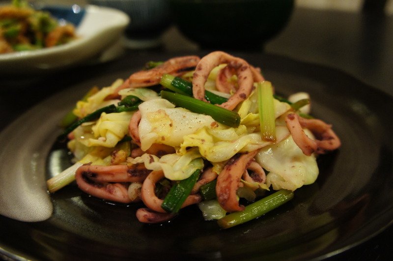 イカとキャベツ・葉ニンニクの炒めもの