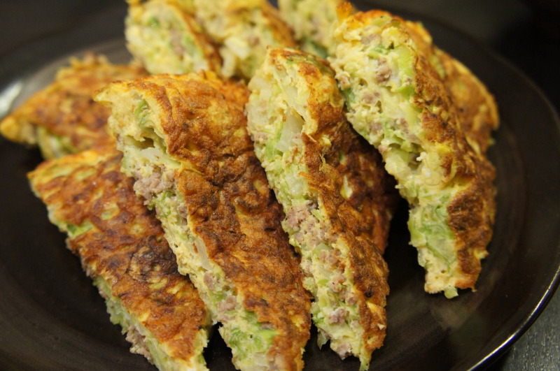 キャベツの千切りと挽き肉のオープンオムレツ、