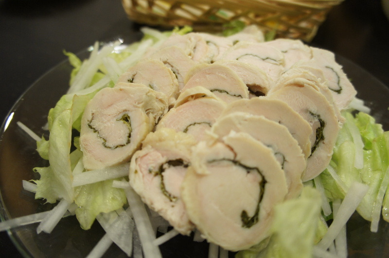 自家製鶏ハム。真ん中にシソを巻き巻き。