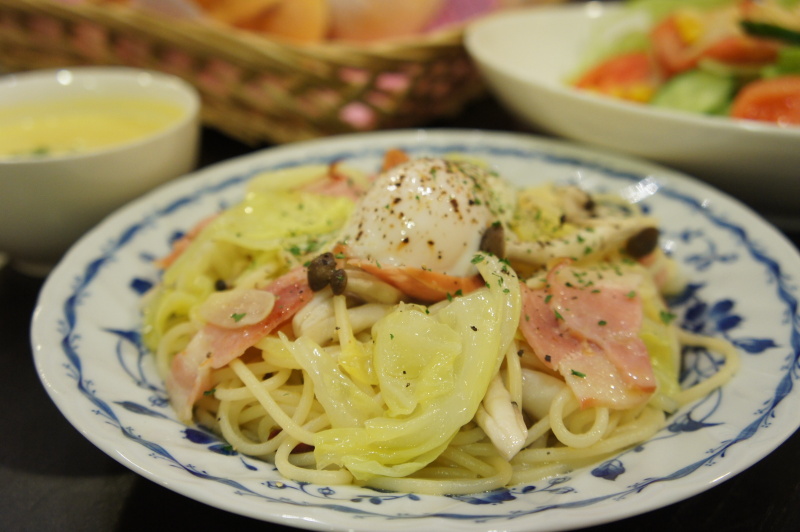 春キャベツとベーコンのペペロンチーノ・温卵添え