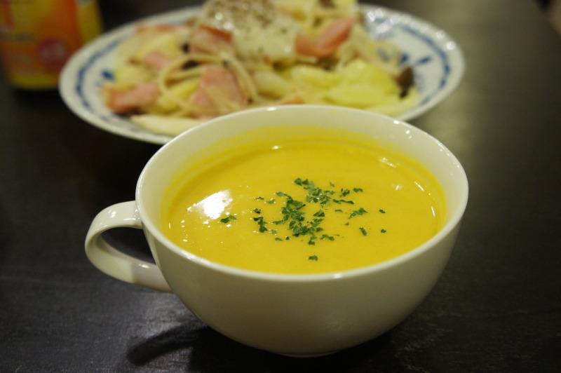 カボチャの甘みとコンソメで、それなりに薄味ですけどついてますから。