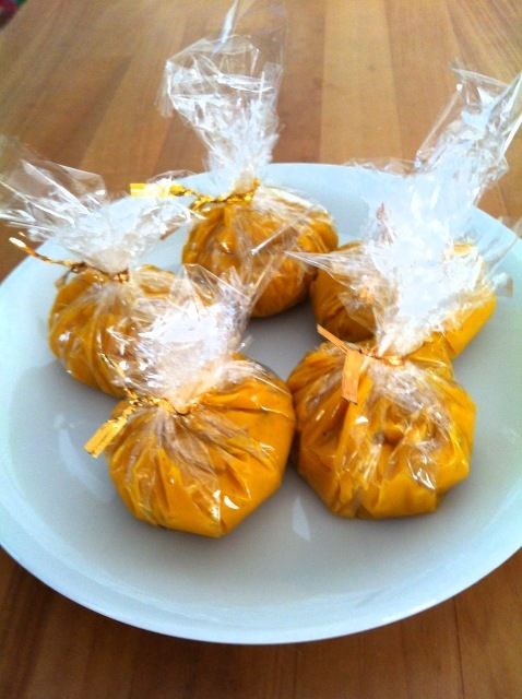 ⑥ココット皿にラップを敷いて、冷やしてペースト状になったカボチャを入れる