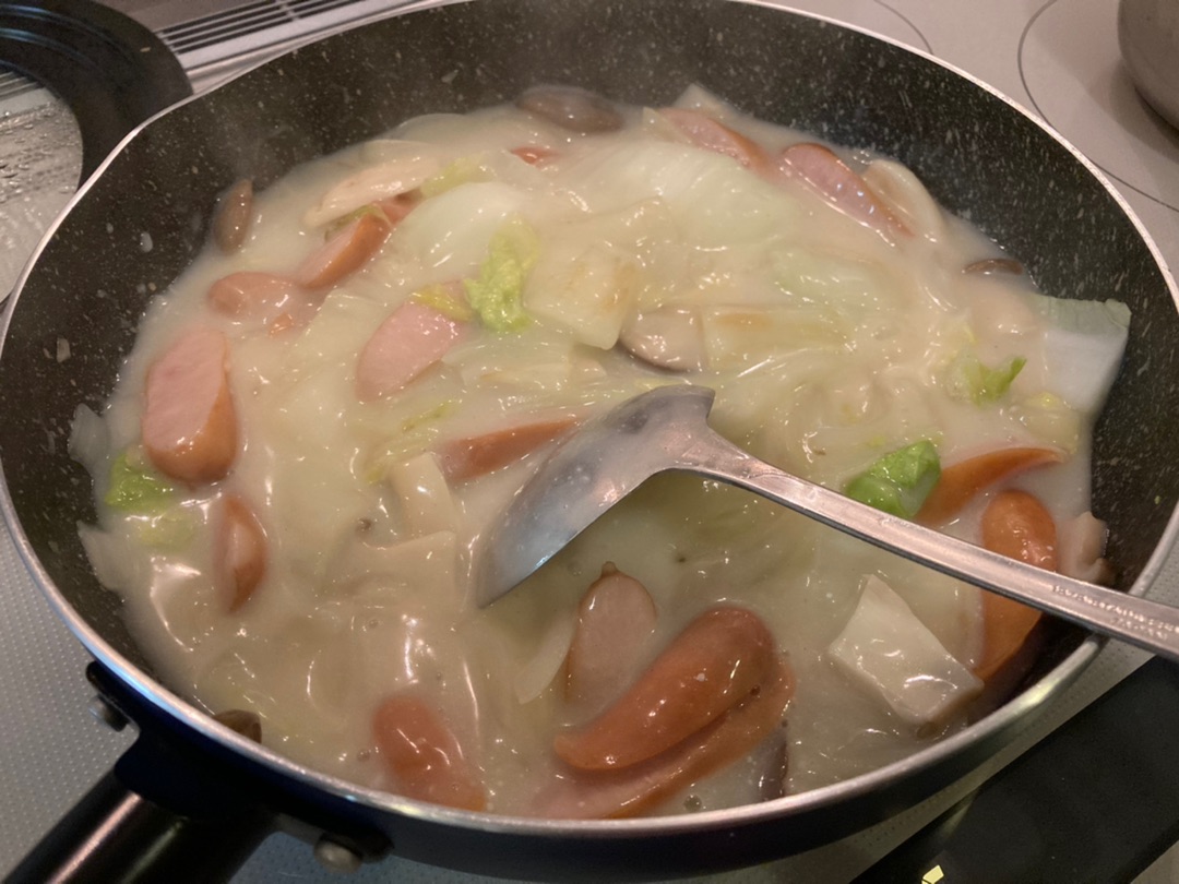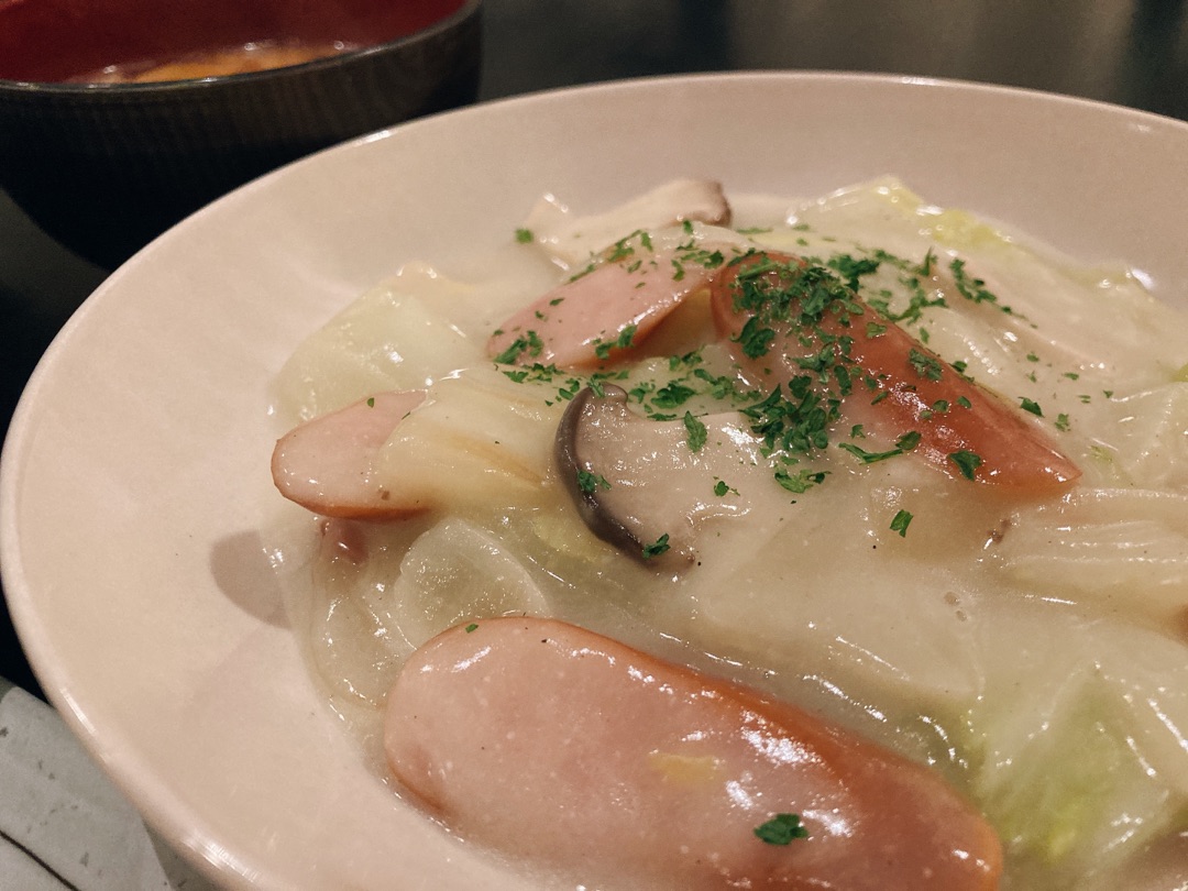 白菜のクリーム煮。エリンギとウインナー、玉ねぎが入っています^^